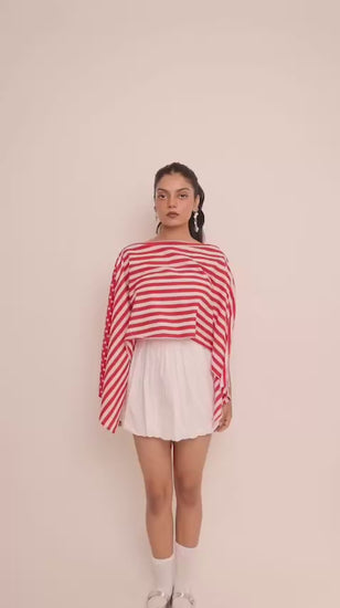 Two moods, one top. This top features bold red stripes on one side and playful red check on the other. Reversible and endlessly versatile, it lets you switch between sharp and fun with ease. Drape it, knot it, or wear it asymmetrically, it’s designed to move with you.