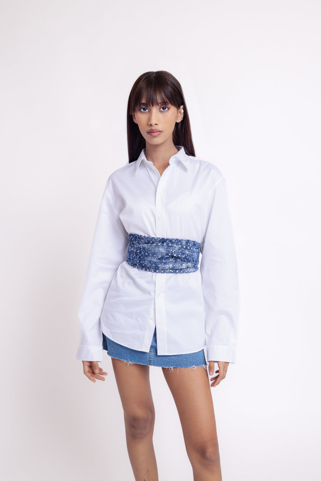 Sculpt your silhouette with the Reversible Denim Obi Belt, crafted for waist definition with a modern edge. Features two shades of denim for versatile pairing.