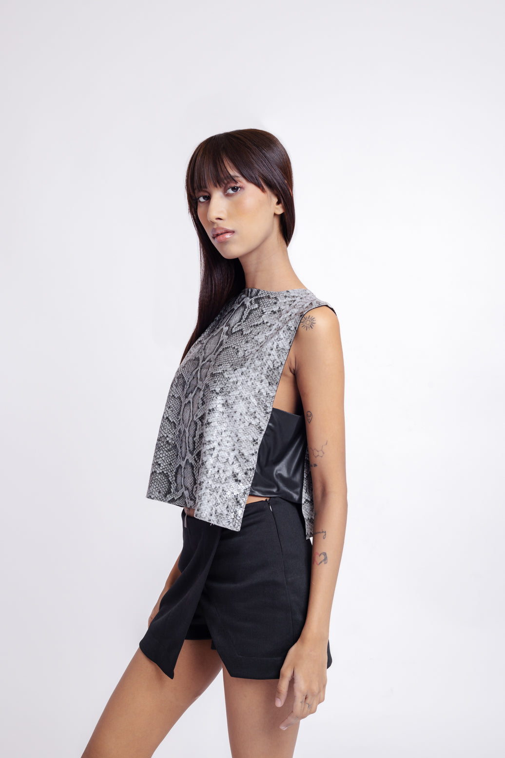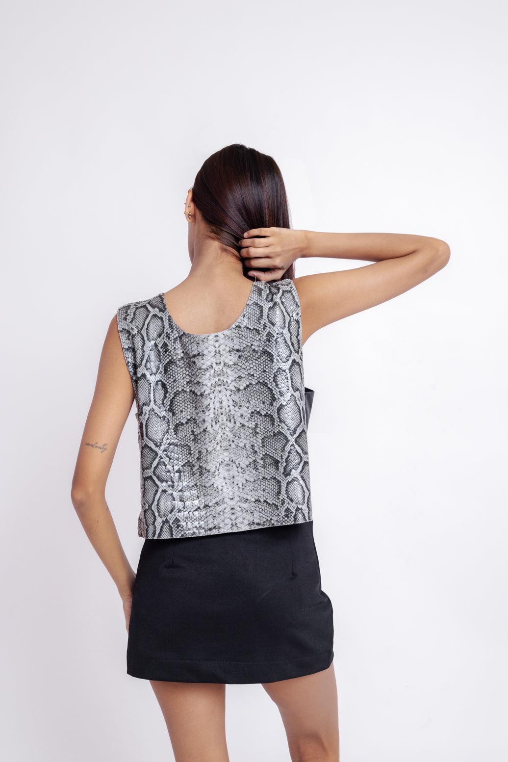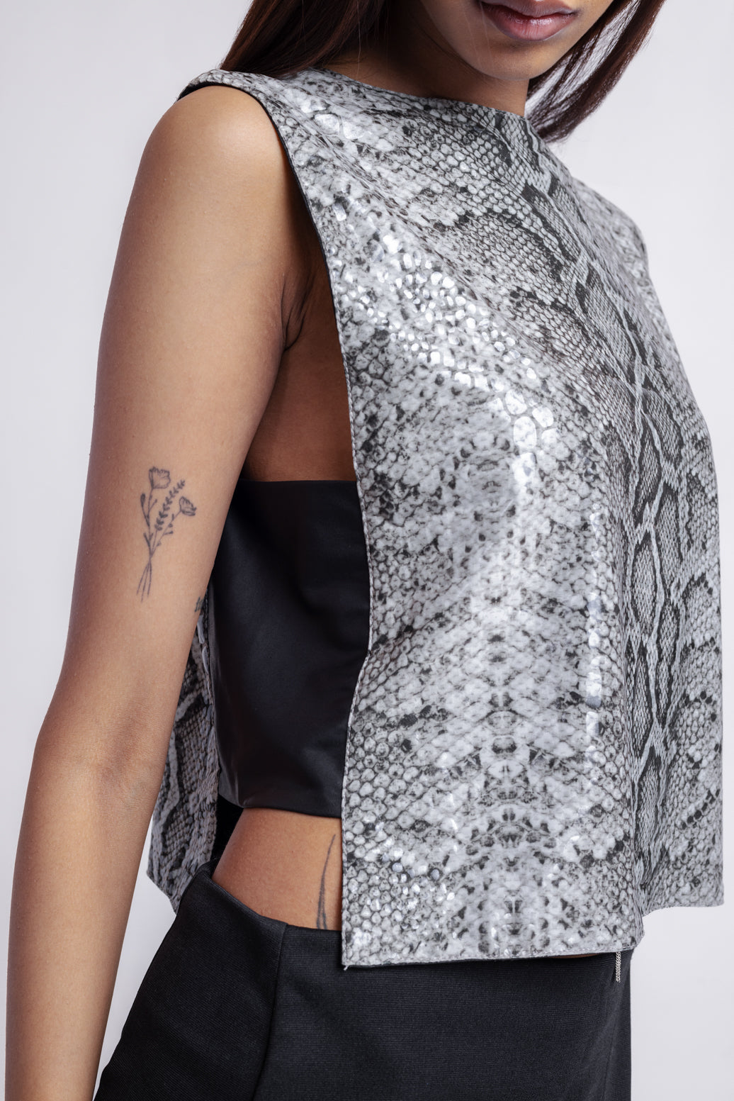 Reversible faux leather top designed with two versatile color options — grey and black. Perfect for day-to-night styling with a sleek fit bottom.